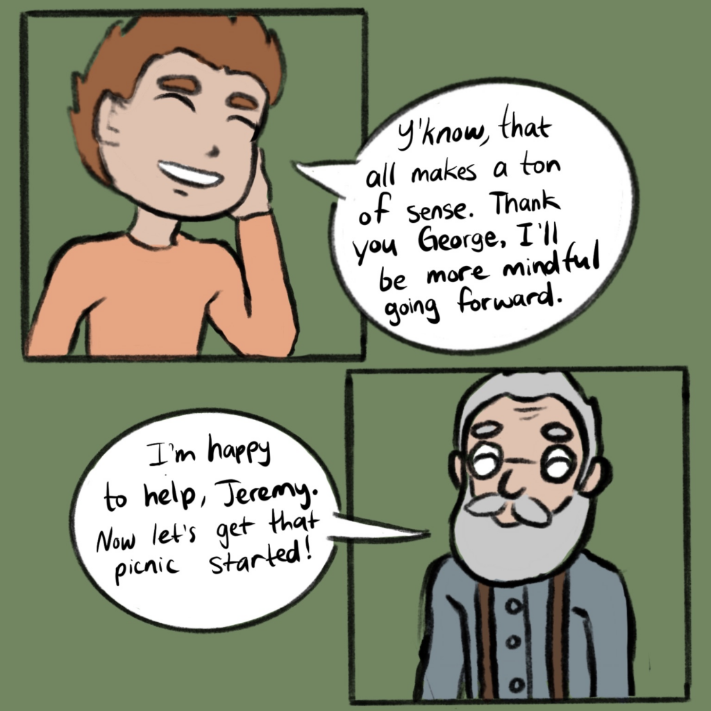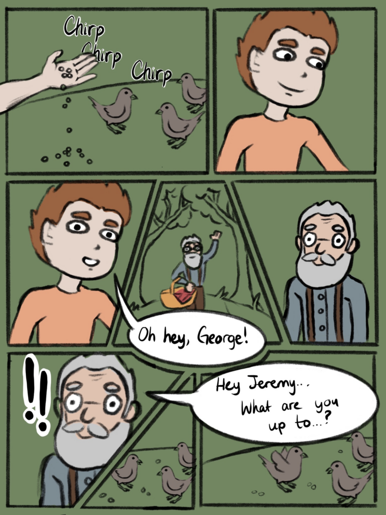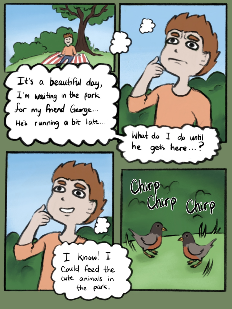 For revisions, I decided to add the additional panels as well as reformat them in my final comic. I added more panels at the beginning to set a better foundation for the story,this included creating the aforementioned panel of Jeremy feeding the birds. In addition to this, I tried to add a bit more text to better contextualize the story and subject. Finally, I added more visual detail to fortify my visual strengths in the prototype, and drew the characters using more time and detail.