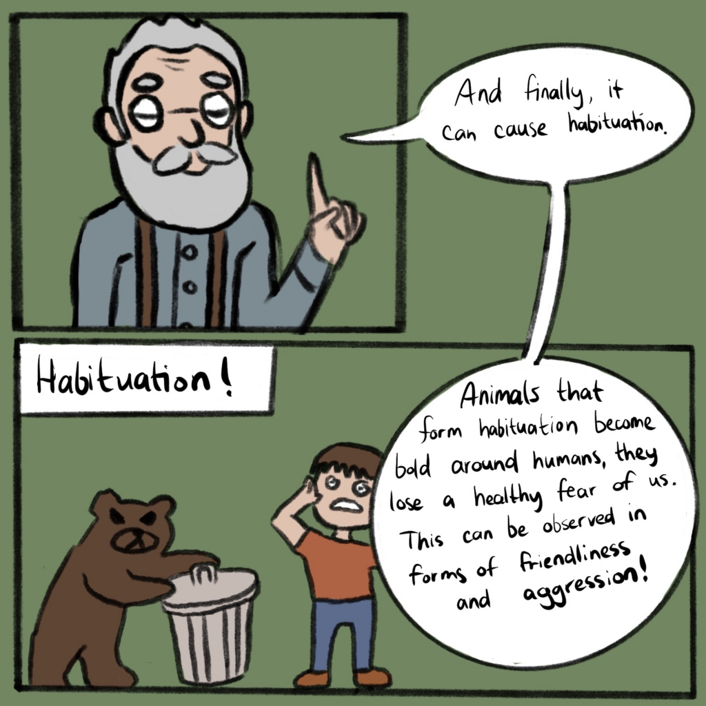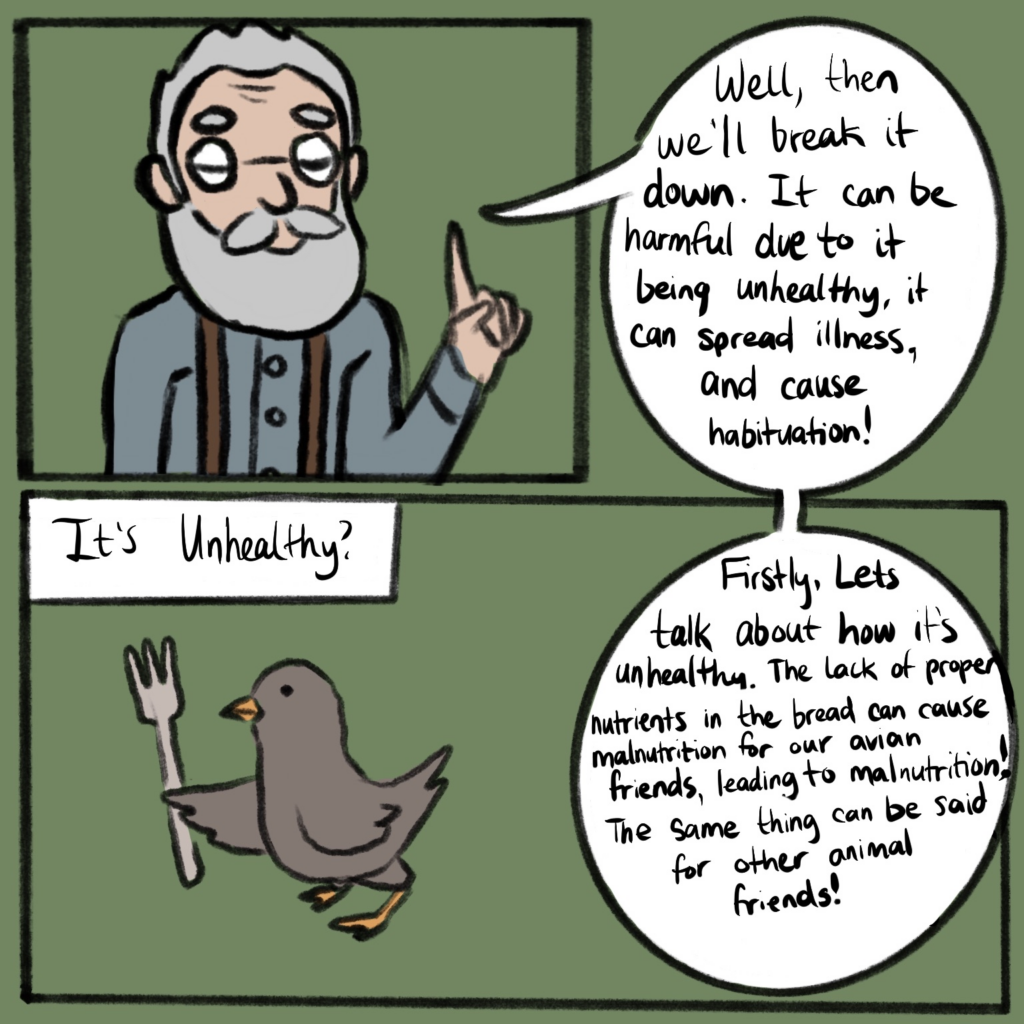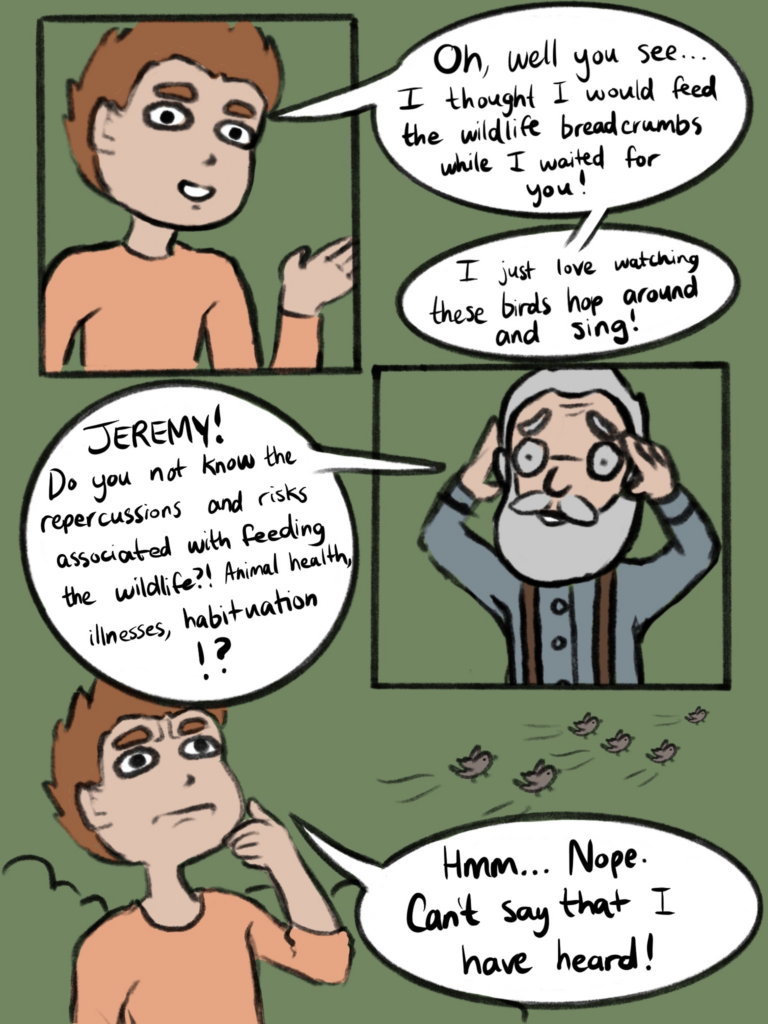 If I were to change anything in the final comic, I would probably add more depth to the complications of feeding the wildlife that are listed within. One of the issues I would have liked to add would be the environmental impact that food litter can have in any natural space, such as bodies of water, parks and trails. I also would have liked to elaborate further on how feeding the wildlife can be done unintentionally through tourism, hobbyism and hiking.