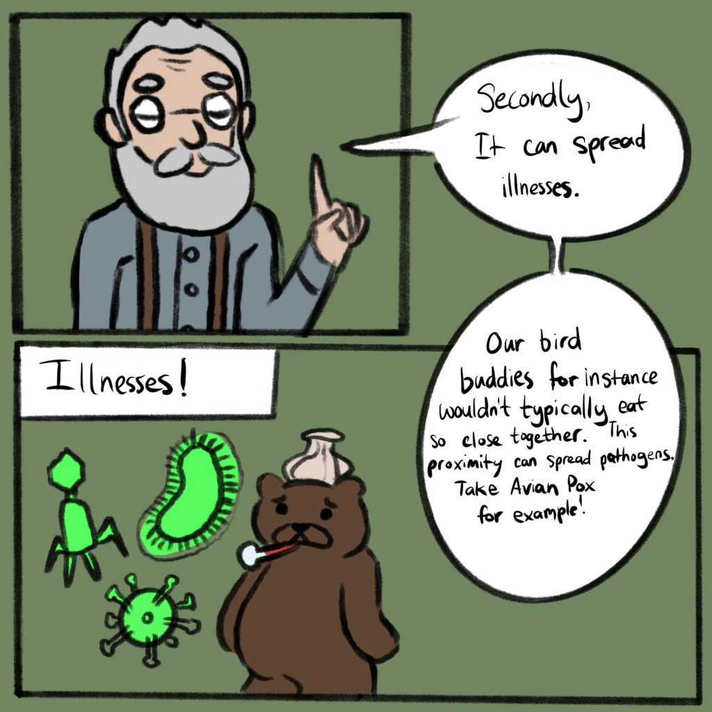 There were a few issues that came up within my overall project, pertaining to the subject itself as well as the method in which I chose to create the comic. With the topic of feeding wildlife, there is some controversy when it comes to feeding birds specifically. Oftentimes people will argue about the ethicality of feeding birds, being split on whether it is good or bad. This raised some problems in my planning process, I wanted to generalize the topic to just broadly address animals than just birds. In terms of the creation, I decided to fully hand draw and colour my comic panels which I think set me back a bit for time, as well as did not reach the expectations I had for myself.